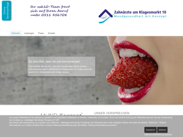 Herzlich Willkommen bei der Zahnarztpraxis zak10 - Zahnärzte am Klagesmarkt 10 in Hannover! Unser Ziel ist es, unseren Patienten aus allen Gesellschaftsbereichen durch das MUND-Konzept® die Möglichkeit zu geben, ihre Zähne ein Leben lang gesund und funktionsfähig zu erhalten. Wir gewährleisten Ihnen mittels neuester Technologie und einem langzeiterprobten Konzept eine optimale zahnmedizinische Behandlung. Als moderne und ganzheitliche Zahnarztpraxis in Hannover mit dem Schwerpunkt Implantologie haben wir uns durch jahrelange Erfahrungswerte zu einer der führenden Praxen in Hannover etabliert. Vereinbaren Sie noch heute einen Termin, gerne auch online. Wir freuen uns auf Ihren Besuch!